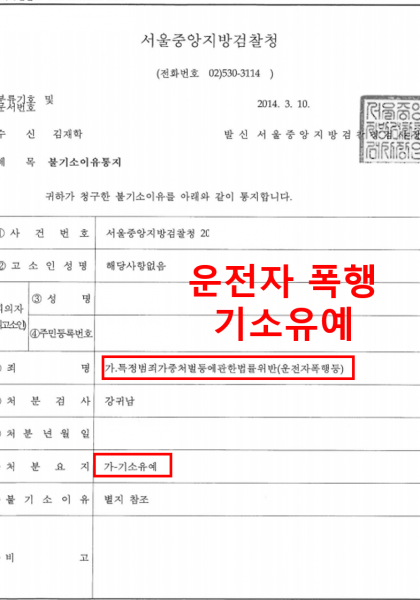 #특정범죄가중처벌등에관한법률위반(운전자폭행) #운전자폭행 #기소유예 # 불기소결정 1 기초사항의 뢰 인 : 40대 남성혐..