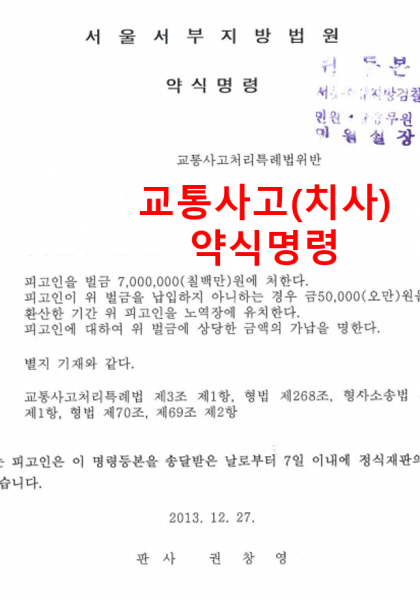 #교통사고처리특례법위반(치사) #벌금 #약식명령 1 기초사항의 뢰 인 : 30대 남..