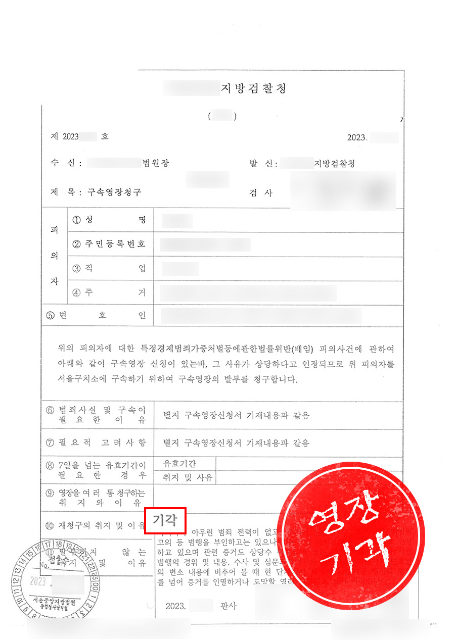 재판부는 변론에 나타난 의뢰인의 전력과 증거를 다수 살폈을 때 증거 인멸 및 도주의 위험이 있다고 볼 수 없다며 검찰의 구속영장 청구를 기각 결정하였습니다.