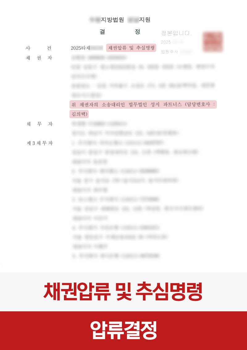 이에 따라 채권자는 법적으로 해당 채권을 추심할 수 있는 권한을 확보하게 되었으며 채무자의 재산 은닉이나 변제 지연에 대비한 실질적인 집행 기반을 마련할 수 있었습니다.