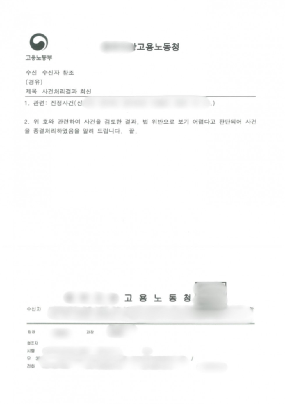 노동청은 사건을 검토한 결과, 법 위반으로 보기 어렵다고 판단하여 사건을 종결처리하였습니다.