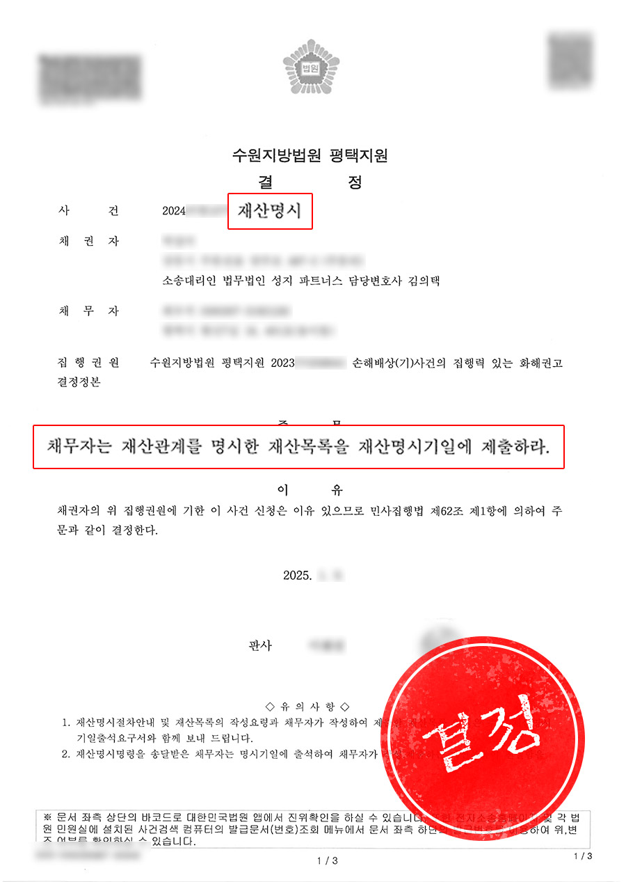 의뢰인은 채무자의 재산 현황을 파악하지 못한 상태였습니다. 이에 본 대리인은 채권 확보를 위한 압류 및 가압류 절차에 앞서 민사집행법 제61조에 근거한 재산명시 신청을 고려하였습니다. 다만 채무자의 주소지가 불명확하여 민사소송법 제255조에 따른 주소보정 절차를 먼저 진행하였습니다. 이후 재산명시 절차의 실효성을 확보하고 향후 강제집행의 기초를 마련하기 위한 전략을 펼쳤습니다.