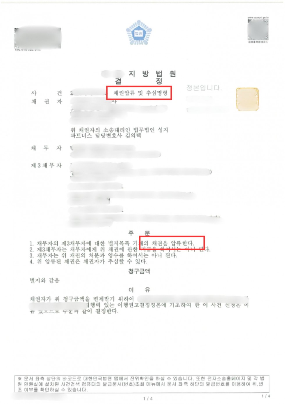 법원은 채권압류 및 추심명령을 인용하였습니다.