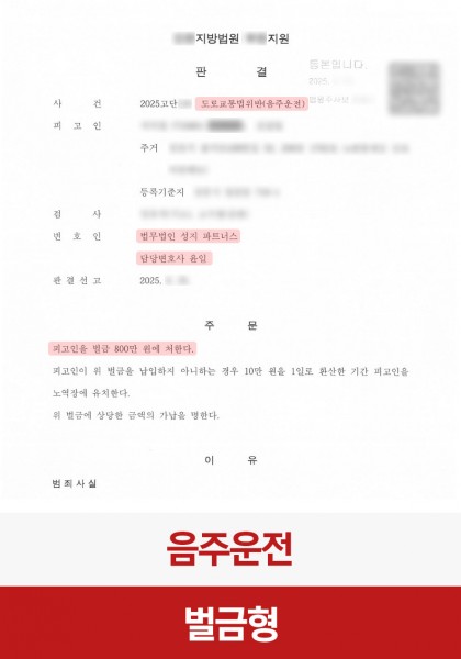 [형사] 음주운전 벌금 800만 원 선고 사례
