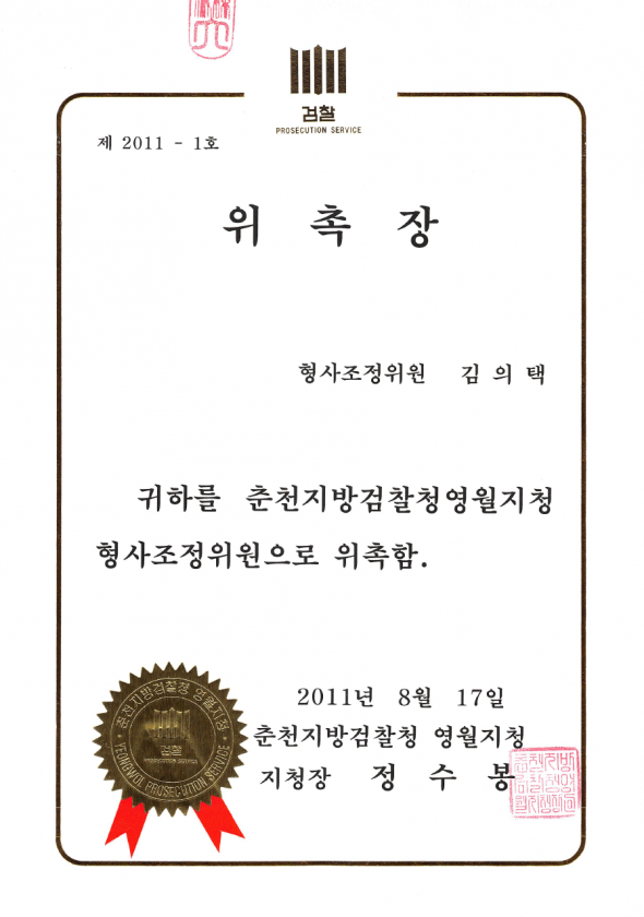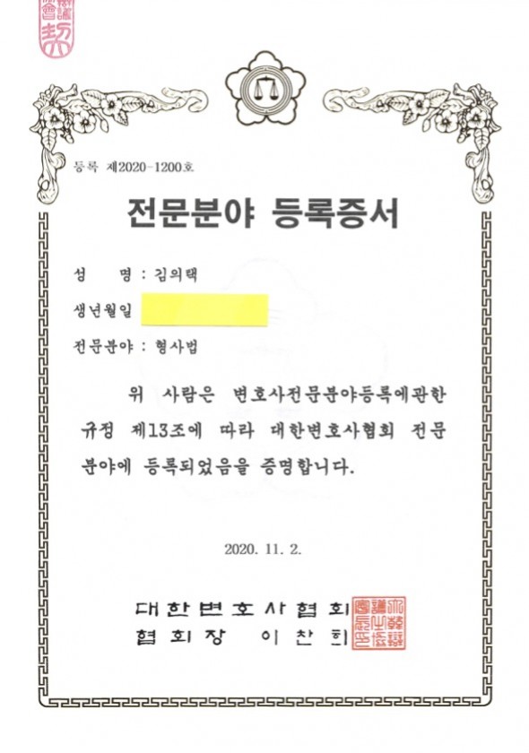 대한변호사협회 전문분야 등록증서 형사법-김의택