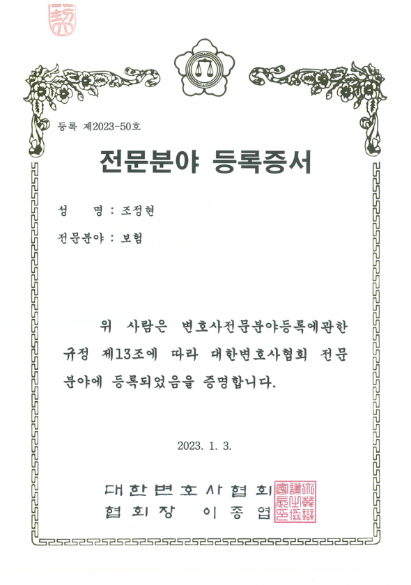 대한변호사협회 전문분야 등록증서 보험-조정현