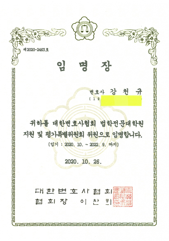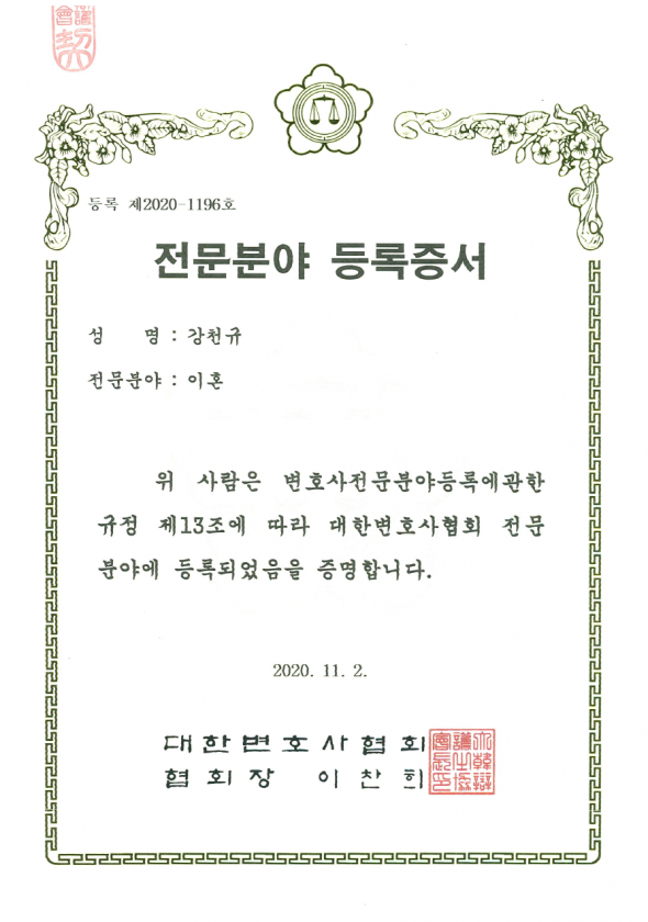 대한변호사협회 전문분야 등록증서 이혼-강천규
