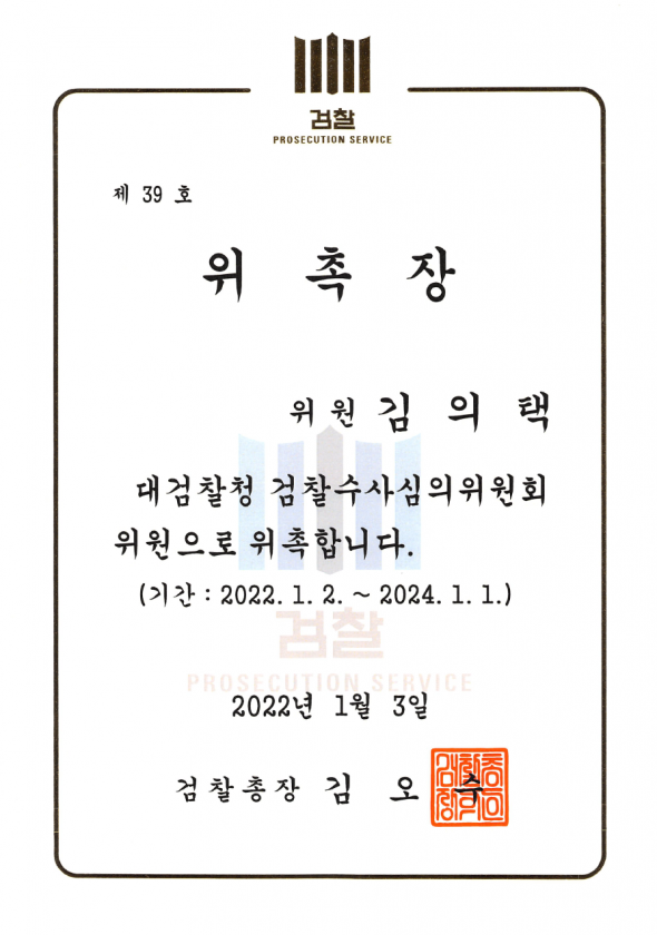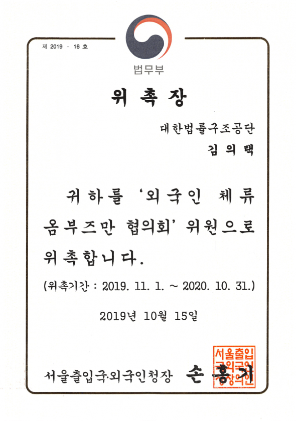 법무부 서울출입국 민원조정위원회 외부위원-김의택