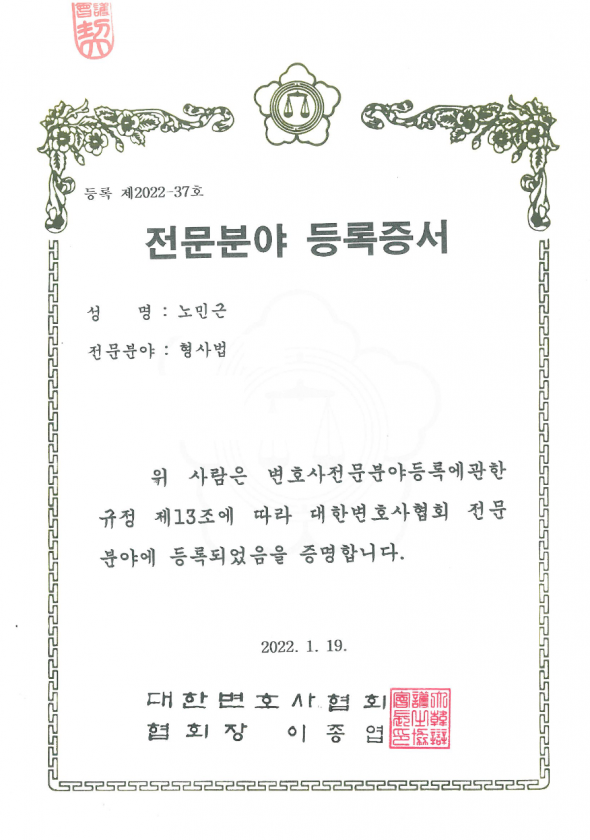 대한변호사협회 전문분야 등록증서 형사법-노민근