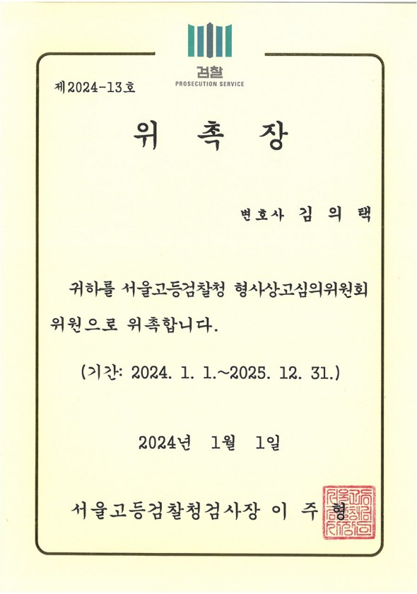 서울고등검찰청 형사상고심의위원회위원 위촉-김의택