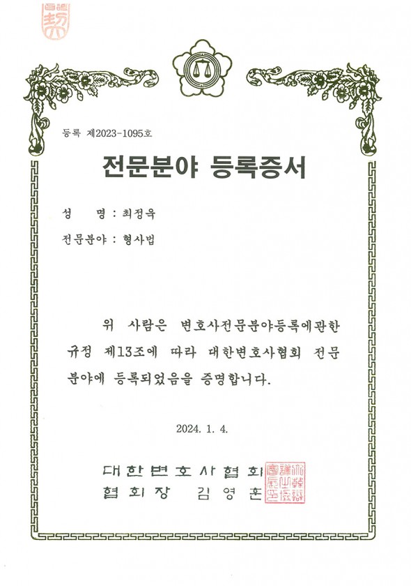 대한변호사협회 전문분야 등록증서 형사법-최정욱