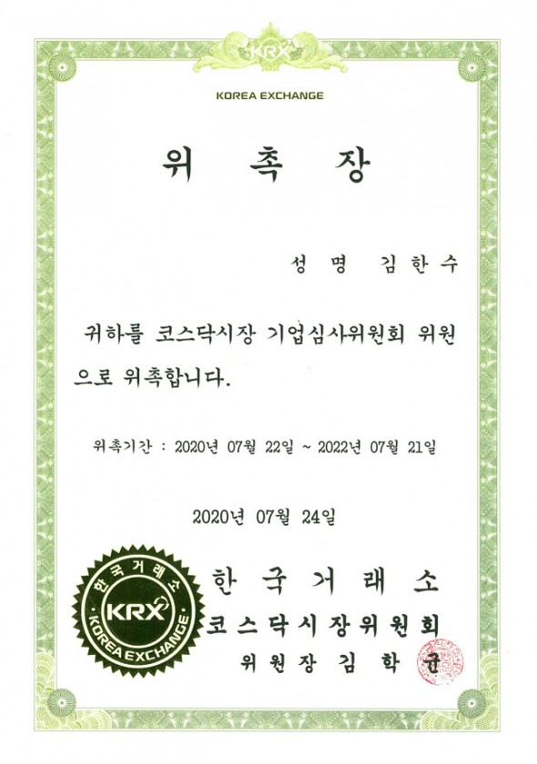 코스닥시장 기업심사위원회 위원-김한수