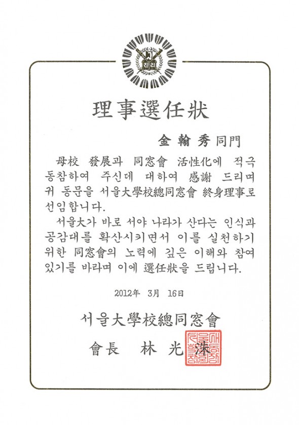 서울대학교총동창회 이사선임장-김한수