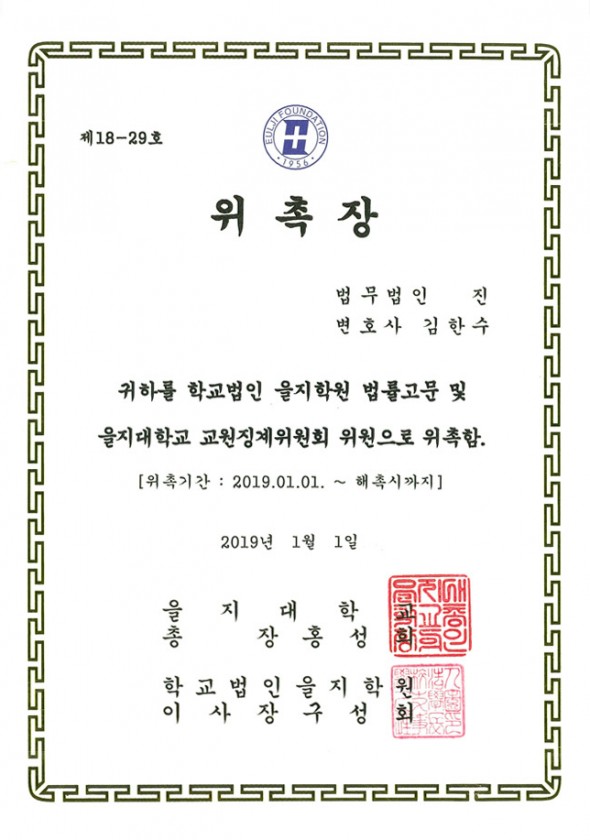 을지학원 법률고문 및 교원징계위원회 위원-김한수