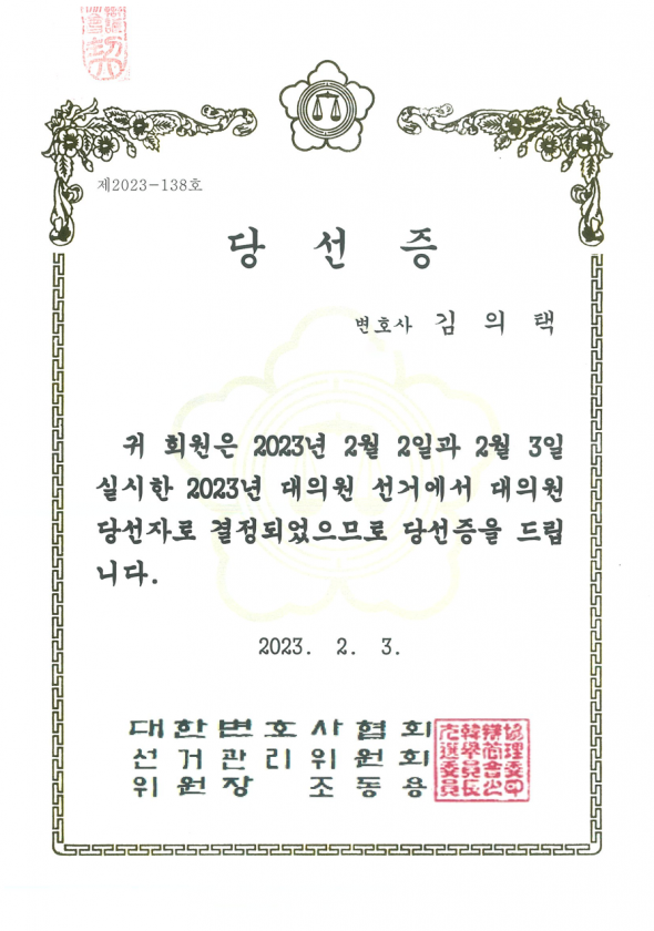 대한변호사협회 대의원 당선 - 김의택