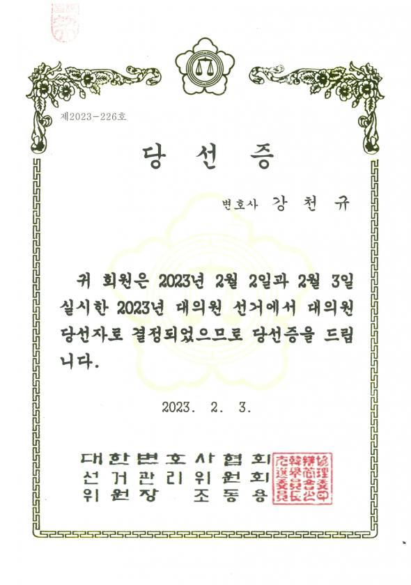 대한변호사협회 대의원 당선 - 강천규