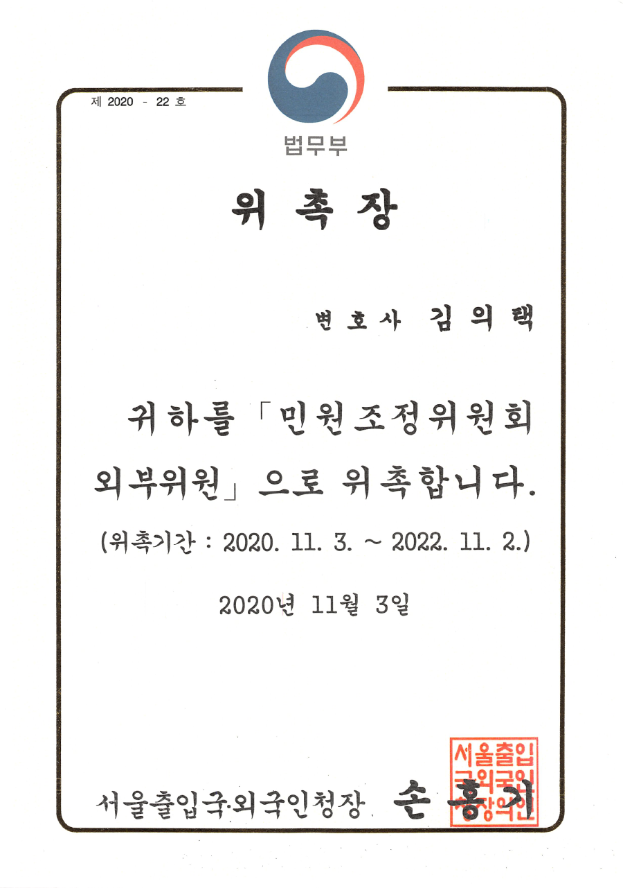 법무부 서울출입국 민원조정위원회 외부위원-김의택