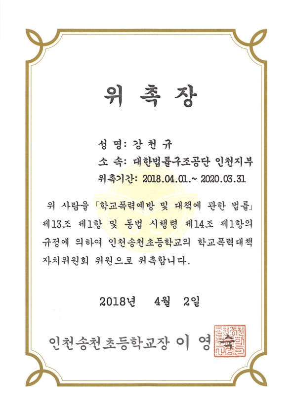 인천 송천초 학교폭력대책자치위원회 위원-강천규