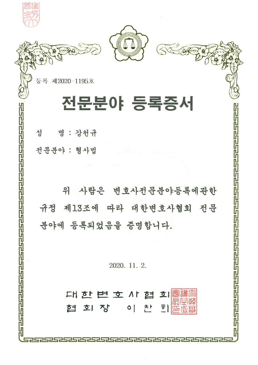 변호사 관련 대한변호사협회 전문분야 등록증서 형사법-강천규