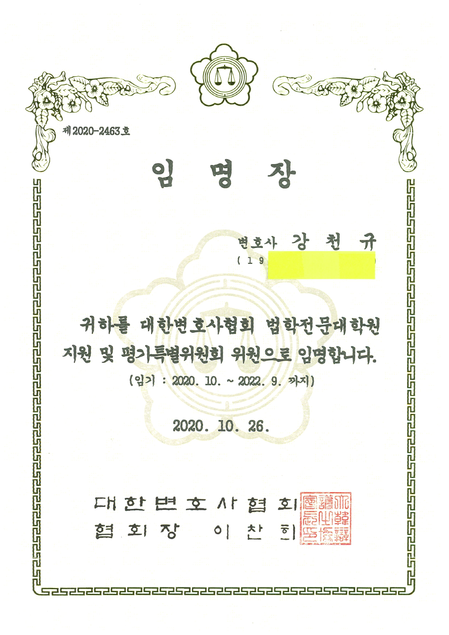 - 다음글대한변호사협회 전문분야 등록증서 형사법-강천규 22.03.29