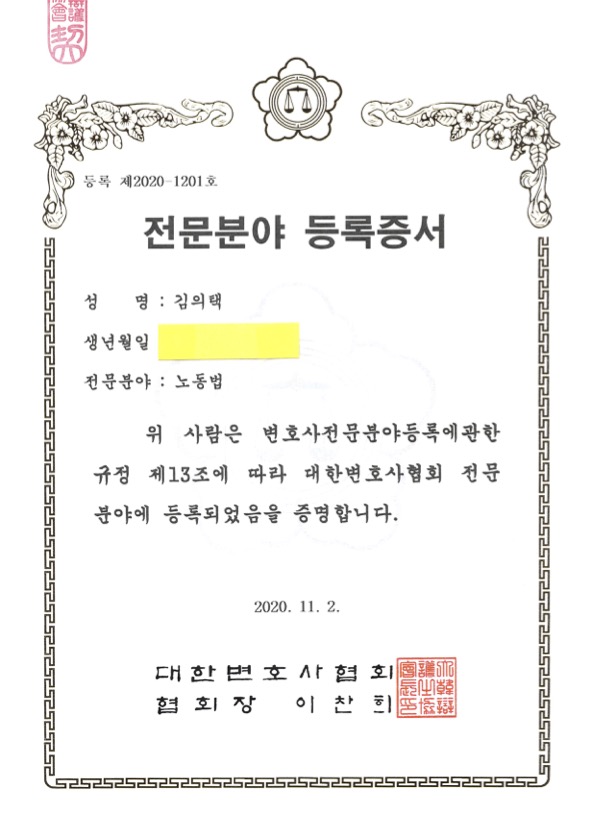 대한변호사협회 전문분야 등록증서 노동법-김의택