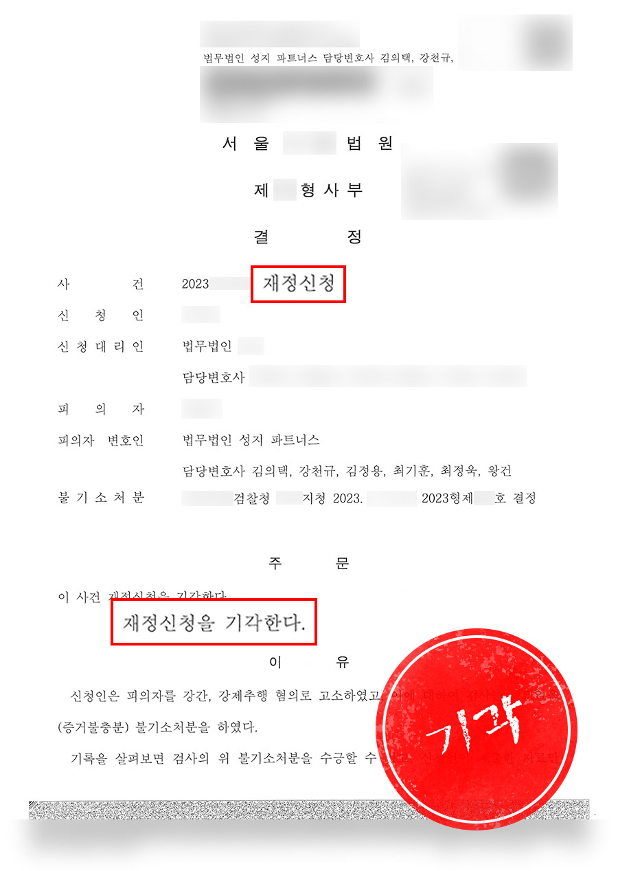 의뢰인은 전 여자친구로부터 강제추행 및 강간 혐의로 피소되었습니다. 이에 법무법인 성지파트너스를 방문하여 변호인을 선임하였습니다. 담당 변호인의 조력으로 혐의가 없음을 밝혀 불기소 처분을 받았습니다. 그러나 고소인이 재정신청을 하여 법원에 불기소 처분에 대한 재판단을 요구하였습니다.