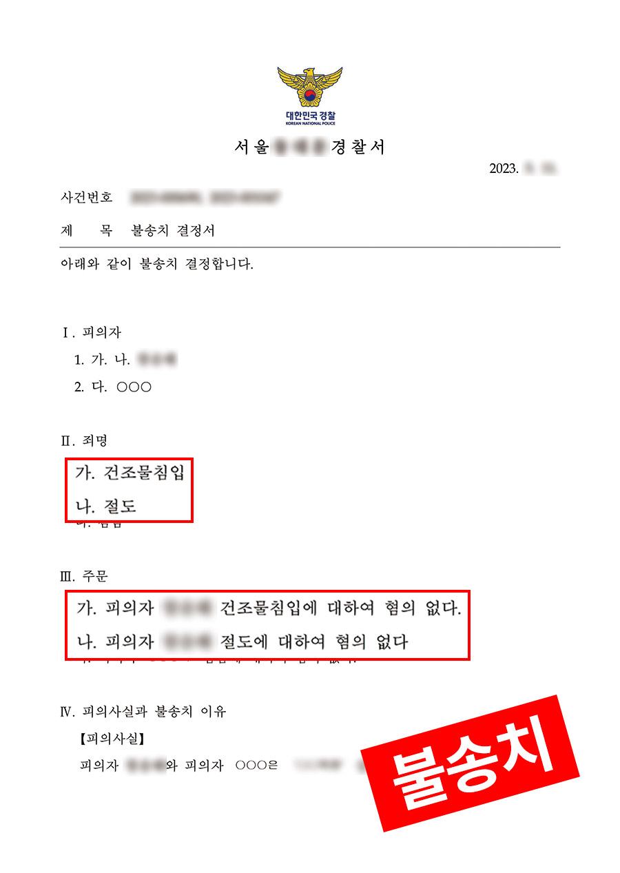담당 경찰관은 의뢰인에게 적용된 범죄의 고의성을 입증할 증거가 불충분하므로 혐의가 없다고 보아 불송치 결정을 내렸습니다.