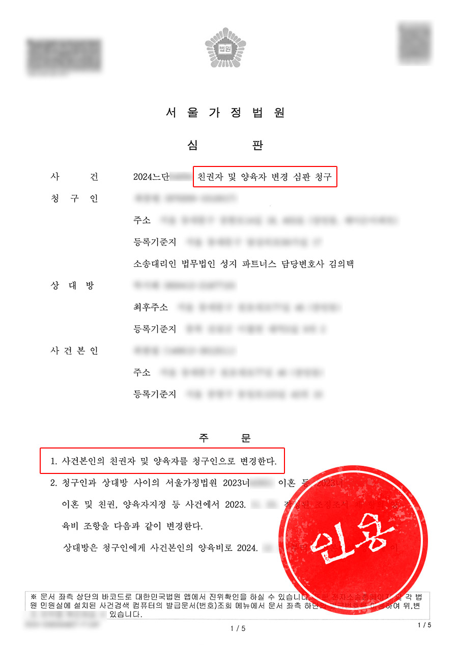 법원은 저희 측의 주장을 인용해 자녀의 양육자 및 친권자를 의뢰인으로 변경했으며 상대방인 전 배우자에게는 매월 30만 원의 양육비를 지급하라고 판결했습니다.