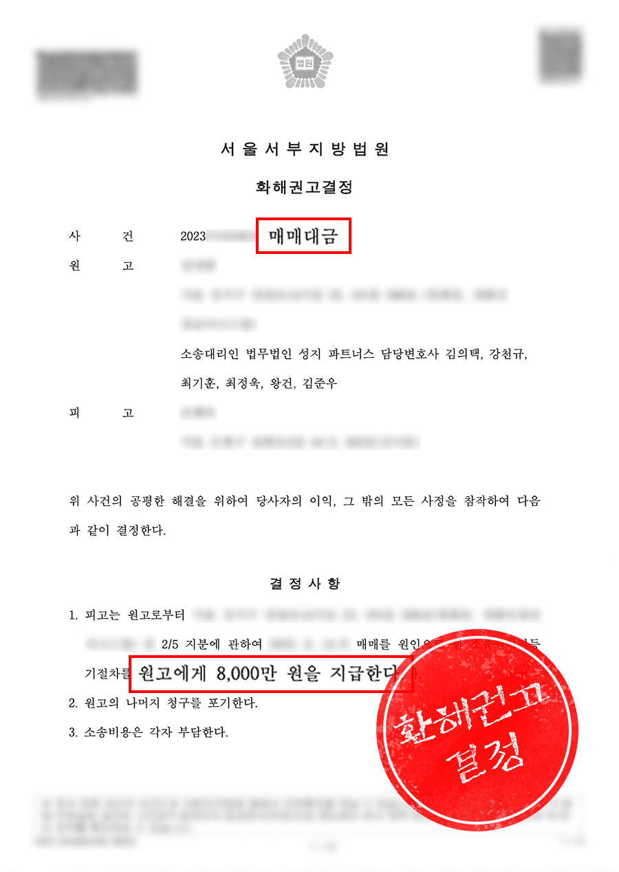 법원은 피고가 원고에게 부동산 매매대금 8천만 원을 지급하고 원고는 피고에게 소유권이전등기를 하라는 화해권고 결정을 내렸습니다.