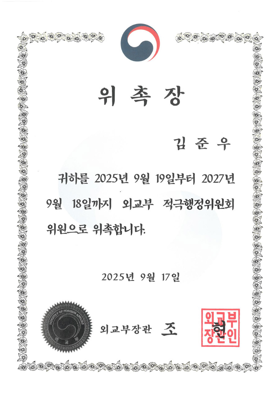 - 다음글대도시권광역교통 실무위원회 위촉장_김의택 25.07.17