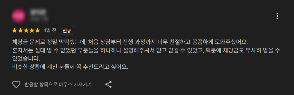 체당금 문제로 정말 막막했는데, 처음 상담부터 진행 과정까지 너무 친절하고 꼼꼼하게 도와주셨어요.