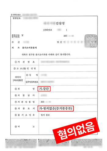 의뢰인은 본 사건의 피해자와 사내연애를 하는 사이입니다. 사건 당일에 의뢰인과 피해자는 피해자가 전 남자친구를 만난 사실로 심하게 다투었습니다. 큰 소리가 났고 경찰도 출동하였으나 피해자가 돌려보냈습니다. 경찰이 떠나고 의뢰인의 화가 누그러졌고 대화로 풀었습니다. 그리고 피해자와 화해한 후 성관계를 가졌습니다. 의뢰인은 피해자와 관계가 회복되었다고 생각하던 차였으나 며칠 후 피해자로부터 강간죄로 고소를 당하였다는 수사기관의 연락을 받았습니다. 의뢰인이 피해자와 연인 관계였으므로 성관계 시 피의자의 폭행 또는 협박 여부가 처분에 영향을 줄 것이었습니다. 그러나 당시 상황을 입증하는 것은 피해자의 진술이 유일하였습니다. 사건 당일에 두 사람의 싸움으로 경찰이 출동한 기록이 있어 의뢰인에게 불리하였습니다. 의뢰인은 피해자와의 관계를 고려하여 변호사 선임을 망설였으나 담당 변호인이 사건을 검토하면서 피해자가 의뢰인이 알고 있는 사실과 달리 진술하였음을 발견하였습니다. 이에 의뢰인은 변호사를 선임하여 적극적으로 방어하기로 결정하였습니다. 피해자는 사건 발생 후 의뢰인에게 피해 상황에 대하여 항의하였고 의뢰인이 범행 사실을 인정하였다고 진술하였습니다. 하지만 담당 변호인은 피해자가 사실과 다른 진술을 하여 진술의 신빙성이 떨어지는 점, 피해자가 증거 자료로 제출한 카카오톡 내용은 상식적으로 의뢰인이 혐의를 인정하였다고 보기 어려운 점, 사건이 일어난 이후 피해자의 행동에 모순된 점이 있음을 지적하며 의뢰인에게 혐의가 없다는 사실을 주장하였습니다. 이에 검찰 측에서는 변론에 따른 사실들을 종합적으로 고려하면, 성관계 시 피의자의 폭행, 협박이 있었다고 보기에 부족하고 달리 이를 인정할 만한 증거가 없다며 혐의 없음 처분을 내렸습니다.